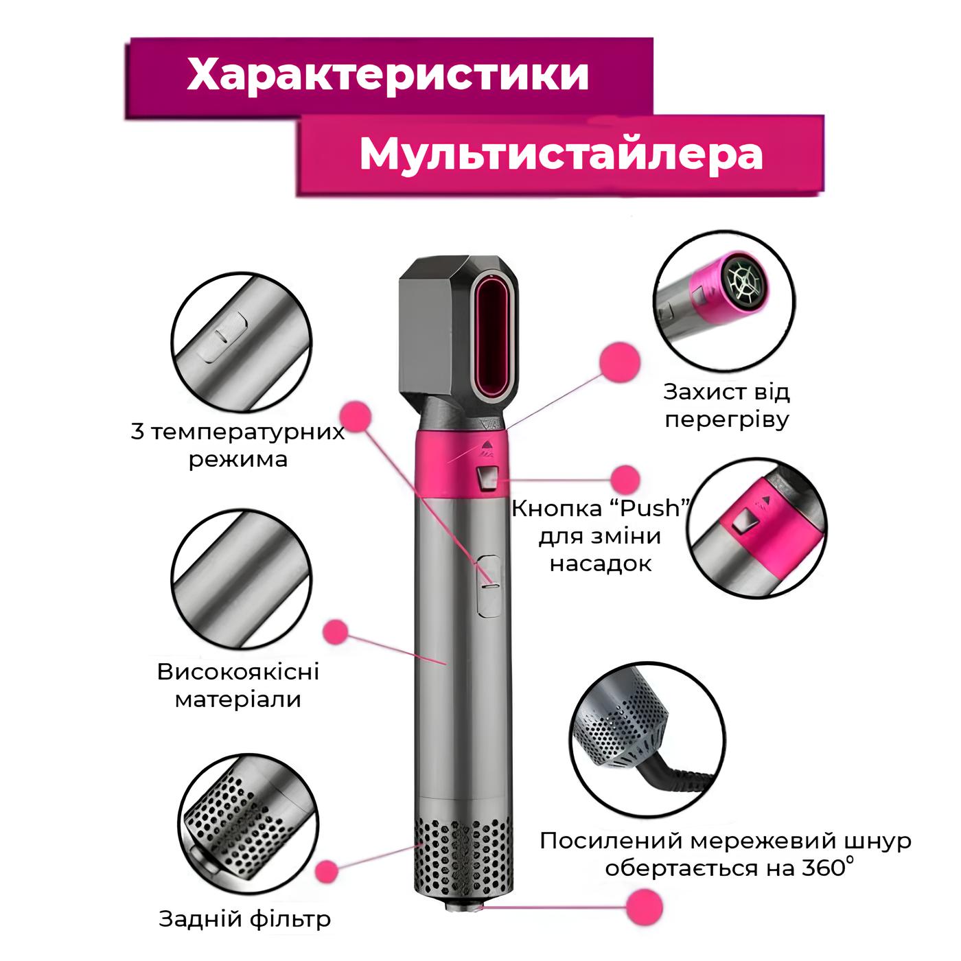 Стайлер з 5 насадками безпечно укладає та сушить волосся без перегріву. Циліндричні насадки створюють локони, а кругла щітка додає об'єму. Завдяки контролю температури, стайлер забезпечує дбайливий догляд та створює зачіски без шкоди для волосся.